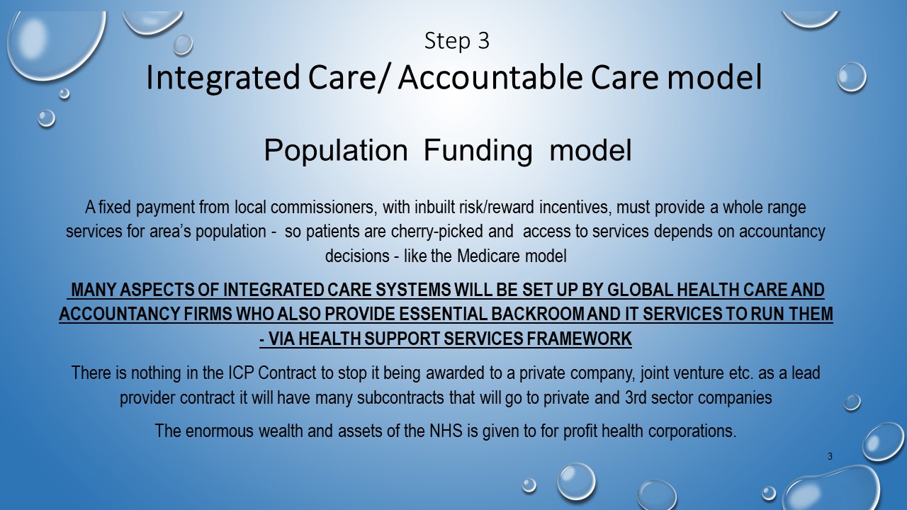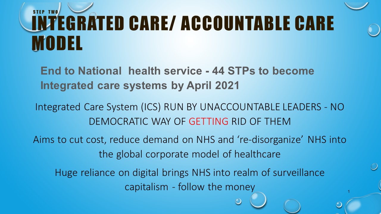 2019 wave of privatization is happening now in every area of England. The NHS and social care are being reorganized. It looks like this