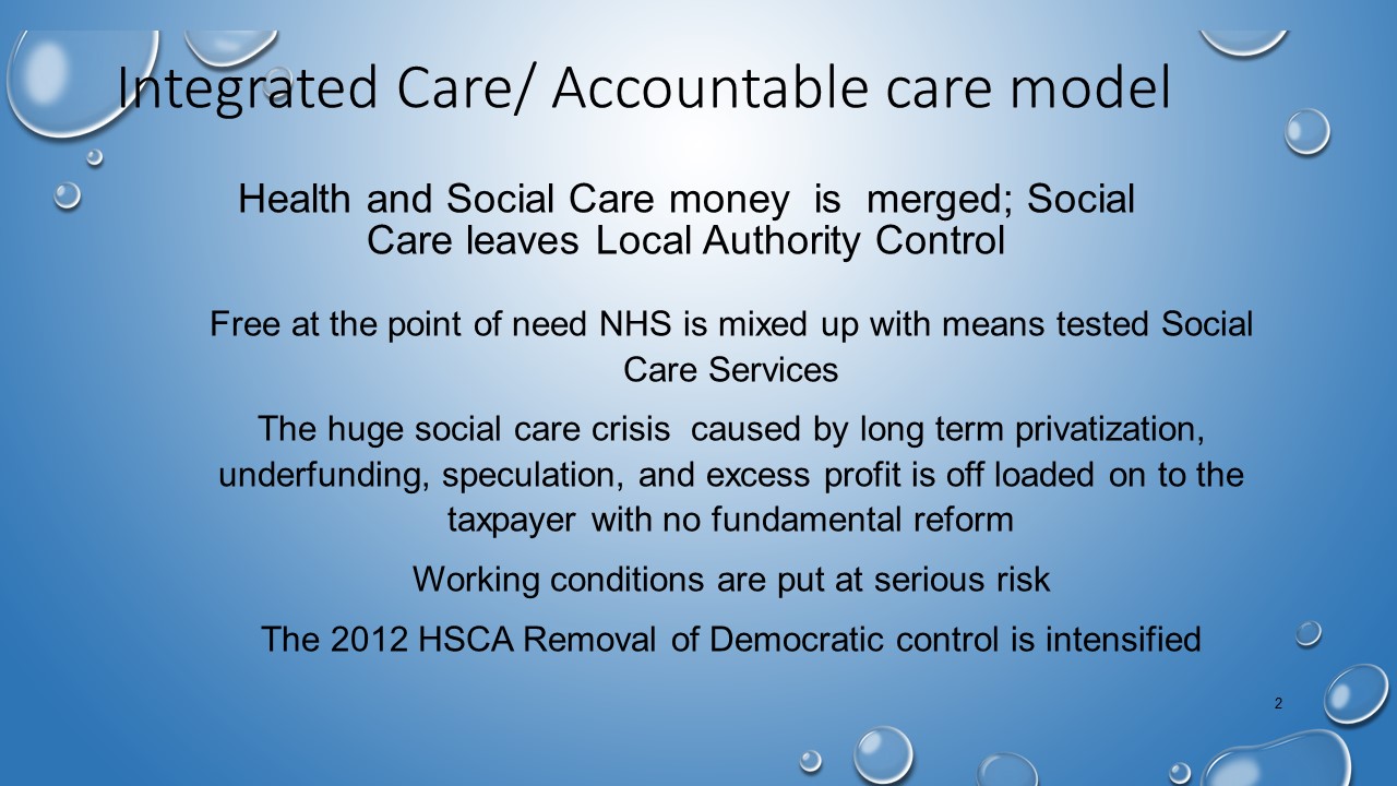 Social care is means-tested and badly funded. Staff less well paid, with less professional development than in the NHS. Social care is in deep crisis. None of the NHS changes addresses these issues. Heath and social care working well together is an admirable aim, but the Integrated Care system does not address this at all. It is an accountancy measure.