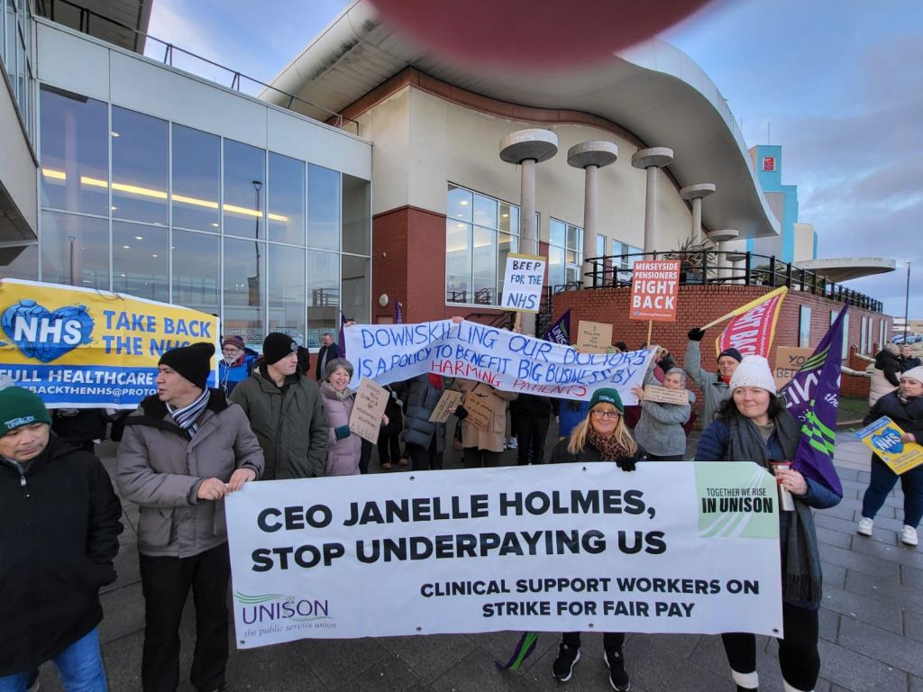 The strike at Arrowe Park and Clatterbridge is about banding and back pay.Clinical Support Workers should be paid band 3 but this group had been paid band 2 for a long time.